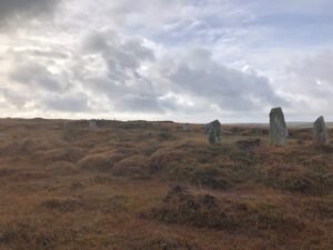 Continuing along this pathway, you eventually reach the stone circle. You can see from this photo, that the chimney stack of Ding Dong mine is visible in the distance, on the horizon.